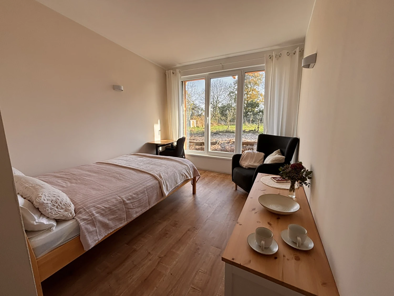 Das moderne Zimmer liegt barrierefrei im neu erbauten Wintergarten, mit bodentiefen Fenstern direkt an der Holunderplantage. Ein großzügiges französischen Bett (140 cm), ein kleiner Schreibtisch und ein modernes Duschbad bieten eine wohnliche Ausstattung zum Schlafen und Arbeiten.